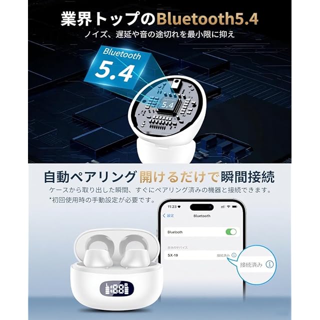 【Bluetooth 5.4+EDR 瞬時自動ペアリング & 優れた互換性】Bluetooth 5.4の遅延が低く、航続が長く、耐干渉性が高い。電池寿命・範囲を飛躍的に向上し、音飛びや途切れ、遅延、ノイズなどが最小限に抑えられ、安定した通信を実現しています。iOSやAndroid、Windows、タブレットとの互換性も向上しており。瞬時にペアリングする手順:①イヤホンを取り出す。②BLUETOOTHをオンにする。③自動ペアリング 初回ペアリング後、2回目の使用で、蓋を開けて携帯電話に自動的に接続できます。
