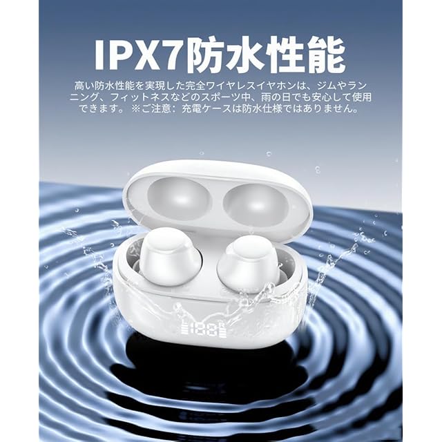 【IPX7防水性能】IPX7 防水防汗。高い防水性能を実現した完全ワイヤレスイヤホンは、ジムやランニング、フィットネスなどのスポーツ中、雨の日でも安心して使用できます。 ※ご注意:充電ケースは防水仕様ではありません。