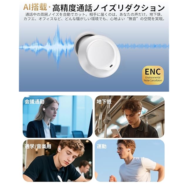 商品名:イヤホン Bluetooth ワイヤレスイヤホン 2つのシリコンマイク搭載 AIスマートENC通話IPX7防水最大70時間再生 2025最新ブルートゥースイヤホン EDR+Bluetooth5.4搭載 カルナ型 HIFI音質低遅延接続瞬時 WEB会議/運動/ゲーム/テレワーク/通学/通勤/スポーツ/音楽用iPhone/Android対応 (white)