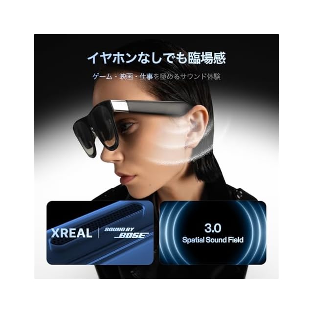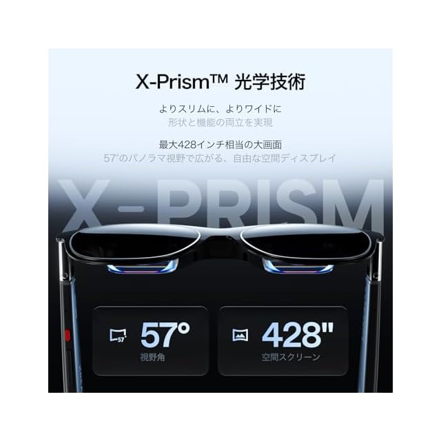 【新搭載「X Prism」光学エンジンで、AR映像体験がさらに進化】 XREAL独自開発の超薄型光学システム「Optic Engine 4.0」により、57°の広視野角で、最大428インチ相当のバーチャルスクリーンを鮮明に投影。 現実の風景を視認しながら、没入感ある映像体験を実現します。 さらに、反射や光の干渉を抑えるアンチグレア設計により、クリアな視界を維持。