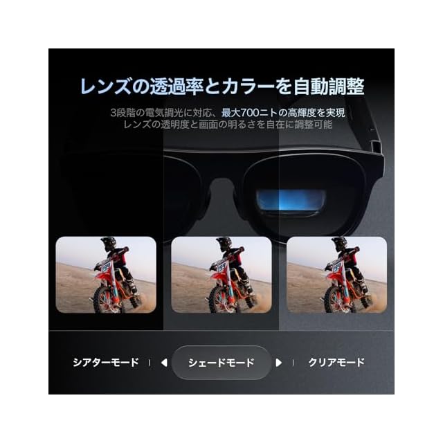 【自然な色彩再現と高輝度表示で屋内外で常にクリア|700ニトの高輝度+調光レンズ】 直射日光下でも見やすい700ニトの輝度と、電気調光レンズにより、周囲の明るさに応じてレンズの色味を瞬時に調整可能。どこでも快適な視聴体験を実現。