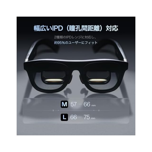 【IPD(瞳孔間距離)に合わせた2サイズ展開[M/L]|95%以上のユーザーに対応する快適設計】 M(57~66mm)/L(66~75mm)の2サイズ、3段階調整アーム、3サイズのノーズパッド、スプリングヒンジを搭載。IPD調整ソフトウェアにより、常に鮮明でブレのない表示を実現。
