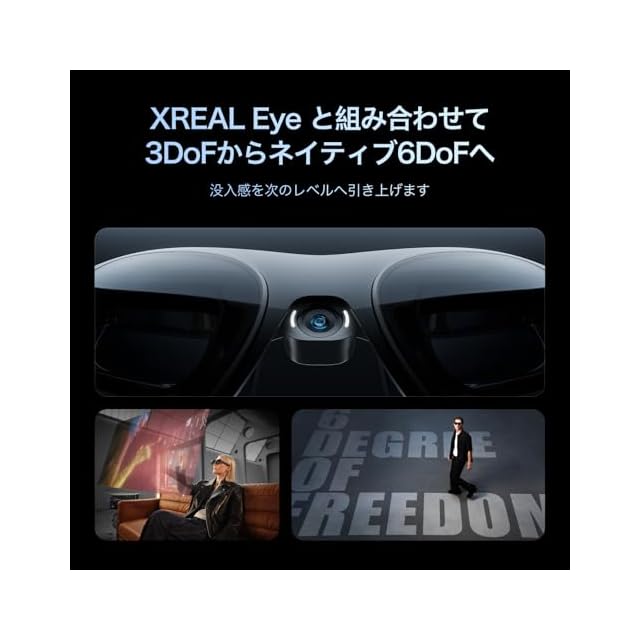 【6DoFで真のAR体験を実現】 「XREAL Eye(別売り)」と連携すれば、部屋の中の任意の位置にスクリーンを固定表示。動いたり、前屈みになっても表示はその場に留まり、圧倒的な没入感と自由度の高い空間体験を提供。