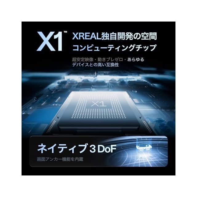 【AR専用X1チップ搭載|空間コンピューティングの新時代へ】 X1チップにより、ネイティブな3DoFトラッキングと超低遅延(3ms)を実現。別売りの「XREAL Eye」カメラと組み合わせることで、6DoF空間アンカー機能に対応し、バーチャルスクリーンを空間内に固定表示。よりリアルで自然なAR体験が可能。