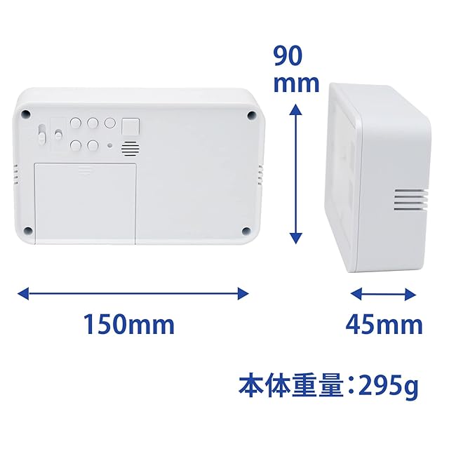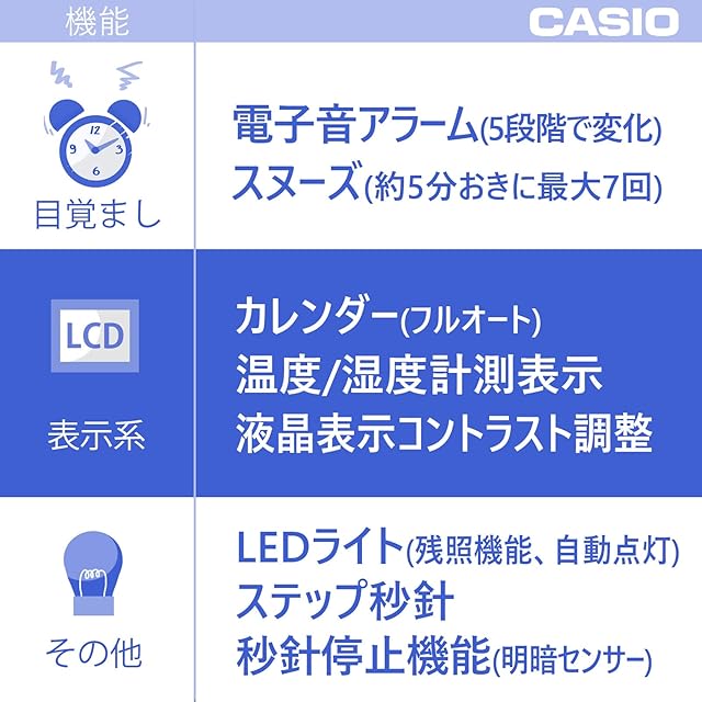 機能・仕様:電波受信機能(自動受信/手動受信切り替え、自動選局機能付き)、電子音アラ-ム(5段階で変化)、止めても止めてもまた鳴るスヌ-ズ機能(約5分おきに7回繰り返す)、LEDライト(残照機能、自動点灯)、秒針停止機能(明暗センサ-により暗くなると秒針が停止)、月・日・曜日表示、フルオ-トカレンダ-、温度表示、湿度表示、電波受信インジケ-タ-、電波受信マ-ク表示、液晶表示コントラスト調整