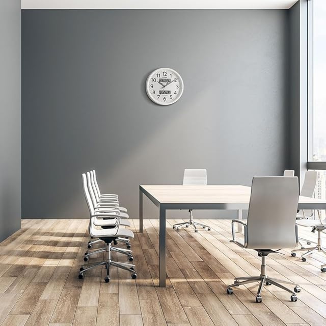 サイズ:35×35×5.6cm 質量:1.3kg 使用電源:単3形×2本(電池別売) ムーブメント:電波時計 機能:連続秒針 温度計(-9.9~49.9℃) 湿度計(20~90%) カレンダー表示(2099年12月31日までプログラム) ユニバーサルデザインフォント使用