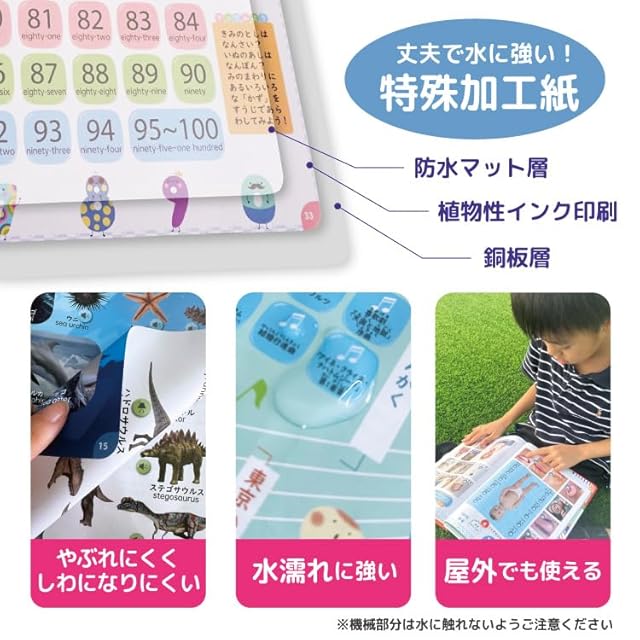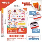 【素材・サイズ】 素材:コート紙、EVA、PP 防水仕様で破れにくく、よだれや汚れにも対応可能。外出先や長時間の使用でも安心してお使いいただけます。 バッテリー:内蔵型(USB Type-C充電対応) サイズ:21.5cm × 28cm × 2cm