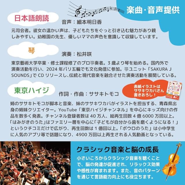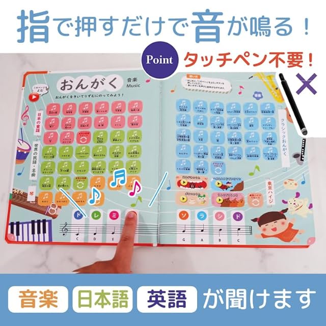 【音楽で感性と脳を育む】 音楽ページにはクラシック楽曲や親子で楽しめる童謡を多数収録。リピート再生機能で子守唄としても使用可能です。 【脳の発達を促すクラシック音楽収録】 小さいころからクラシック音楽に触れることで、脳の発達を促進。 リラックス効果や感性の育成に役立ちます。音のパターンを通じて言語能力の向上もサポートします。 【プロ箏奏者の演奏】 東京藝術大学修了のプロ箏奏者・松井咲氏による美しい箏の演奏を収録。伝統と現代が融合した音色が楽しめます。