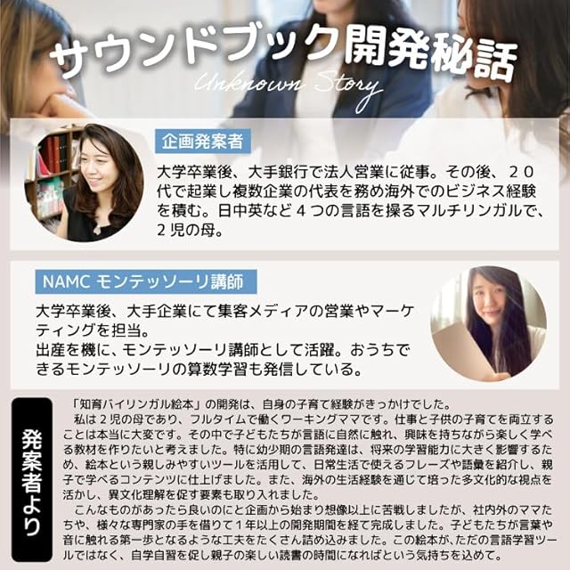 【おすすめポイント】 開発チームの強さ 子育て中のママや、子供向け教育の経験豊富な元講師で構成された開発チームが、実際の子育て現場や教育現場でのニーズを取り入れて丁寧に設計しました。 さらに、現役モンテッソーリ講師による専門監修を受け、教育的視点からも高い品質を実現しています。 当開発チームでは、幼児教育の重要性を深く理解し、子供たちが楽しみながら自然に学べるように内容を工夫しました。 単なる知育教材にとどまらず、親子のコミュニケーションを深めるツールとしても活用できる一冊です。 また、日々忙しい保護者の目線から「安全性」「使いやすさ」「長く使える設計」を追求し、多くの家庭に寄り添う教材となっています。