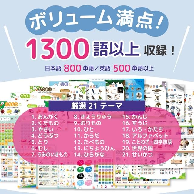 【豊富な学習コンテンツ】 実際の写真やイラストとともに、フルーツ、野菜、動物、鳥、虫、海の生き物、恐竜、乗り物など多彩なカテゴリを網羅。さらに、人の呼び方、体の部位、食べ物、ことわざ、生活の知恵など、日常に役立つ知識を学べます。 【言語と知育の融合】 日本語、英語、ひらがな、漢字、数字、色、形、アルファベットなど、幅広い言語スキルが身に付きます。 四字熟語やことわざも含まれており、基礎教育から高い知的好奇心に応える内容まで対応します。