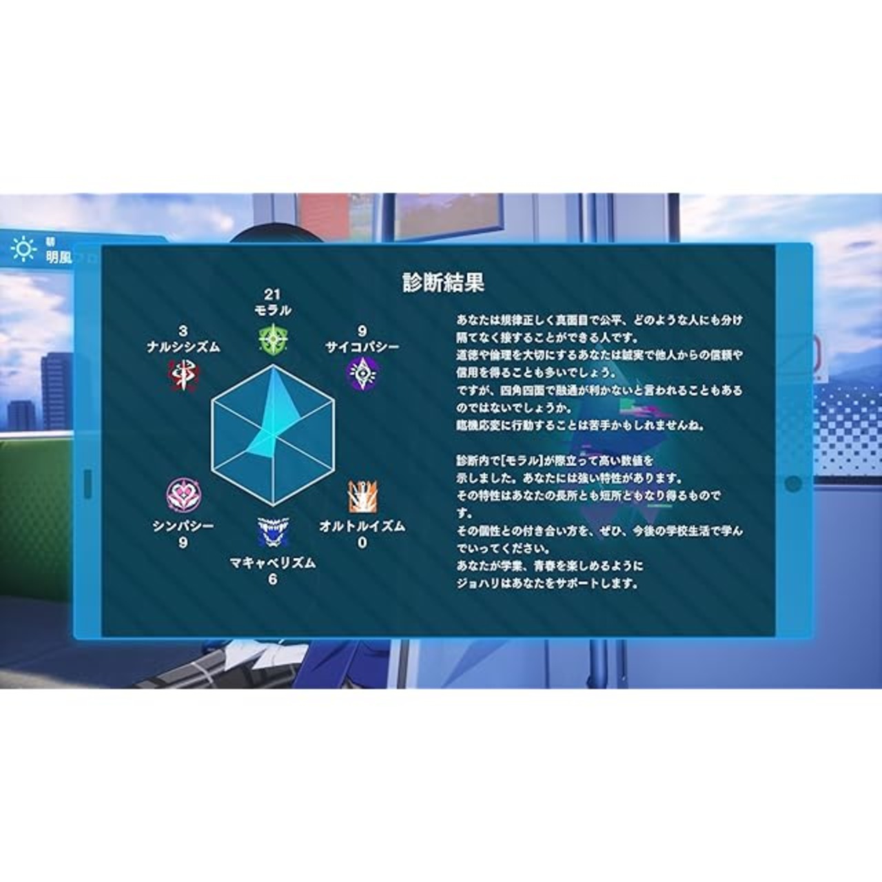 ゲーム内の診断や選択肢により6つのパラメータが変化。会話の選択肢が増えたり、バトルスキルが強化される