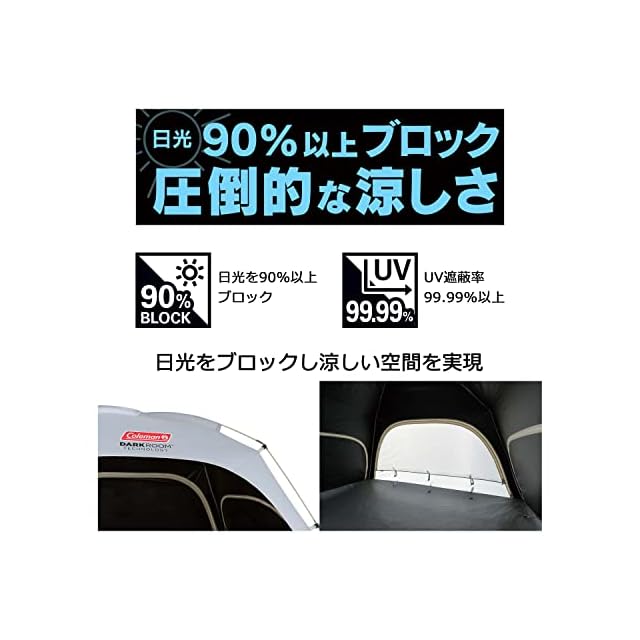 【ダークルームテクノロジー】日差しが強い日や気温が高い日は、熱中症のリスクが高まります。コールマンのダークルームテクノロジーは、日光を90%以上遮断して、シェード内の温度上昇を抑制します。木陰がない公園やプール、海水浴などでは、非常にお勧めの機能です。
