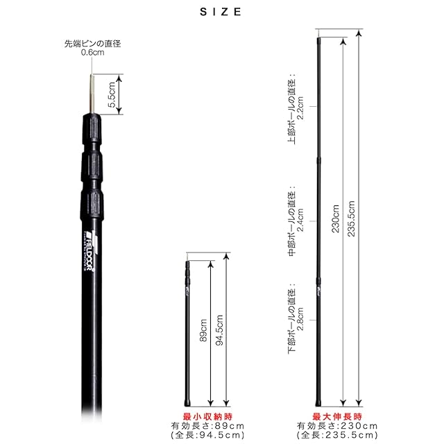 ✅【無段階伸縮式アルミテントポール】 様々シーンで使える、スライド伸縮式テントポール!ポールをスライド、回して固定するだけで長さ調節が可能。高さは無段階で89cm~230cmに調節できます。通常のポールに比べ、収納もコンパクト!