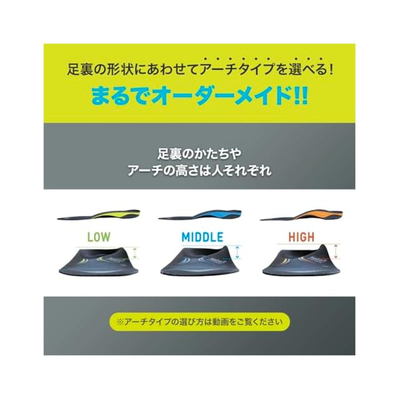 アーチタイプはアーチ測定方法で測定いただき、ご自身に合ったタイプをお選びください