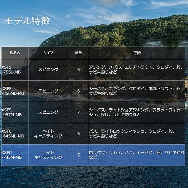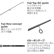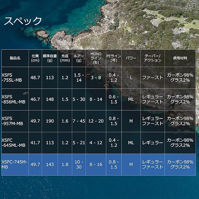 仕舞 (cm)49.7●標準 自重(g)143●先径(mm)1.8●ルアー (g)10 - 30●MONOライン (lb)8 - 16●PEライン (号)0.8 - 1.5●パワーM●テーパー/アクションレギュラーファースト●製法チューブラー●使用材料カーボン98%,グラス2%