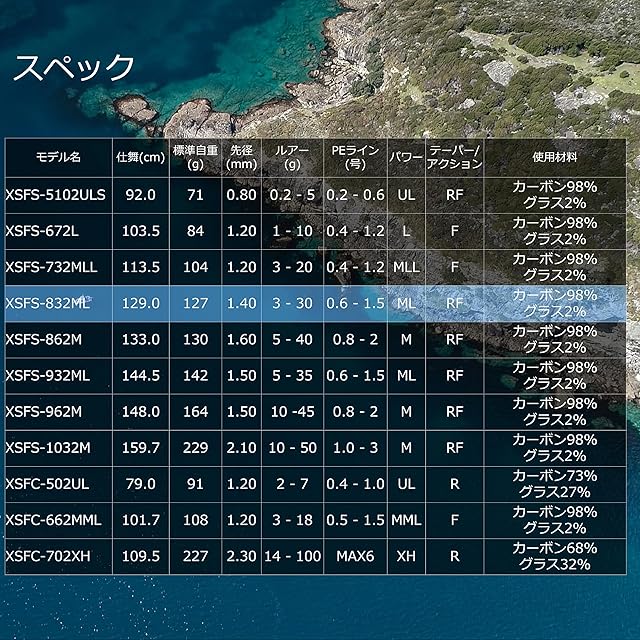 全長(ft/cm)8'3"/251.5●仕舞(cm)129●標準自重(g)127●先径(mm)1.4●ルアー(g)3 - 30●フロロカーボンライン(lb)8 - 14●PEライン(号)0.6 - 1.5●パワーML●テーパー/アクションRF●使用材料カーボン98%,グラス2%