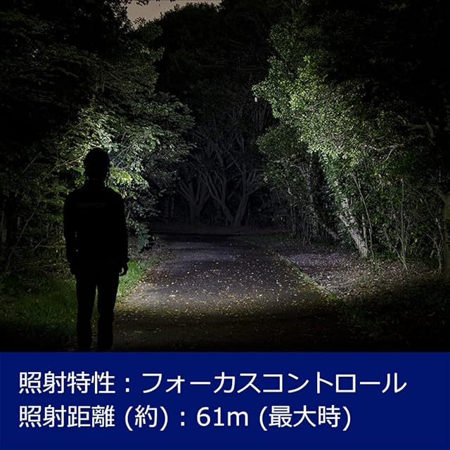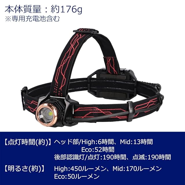 明るさ:High/450ルーメン、Mid/170ルーメン、Eco/50ルーメン、使用電池:専用充電池または単4形アルカリ電池×4本(別売り)