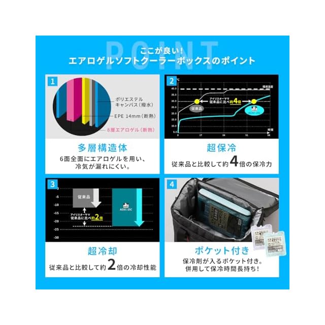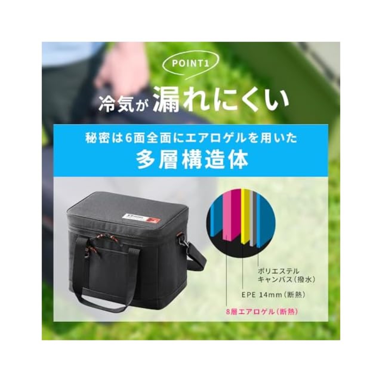 宇宙服にも使用される、高断熱素材“エアロゲル”を使用したソフトクーラーボックス。使いやすい小型サイズ“15L”が登場!ソロキャンプやピクニック、普段使いにおすすめ。最大保冷時間:約3.8日(※)。(※本体容量40%相当の氷を入れ、底面温度が8℃に達するまでの時間。環境温度:30℃→9時間・20℃→15時間の繰り返し。)