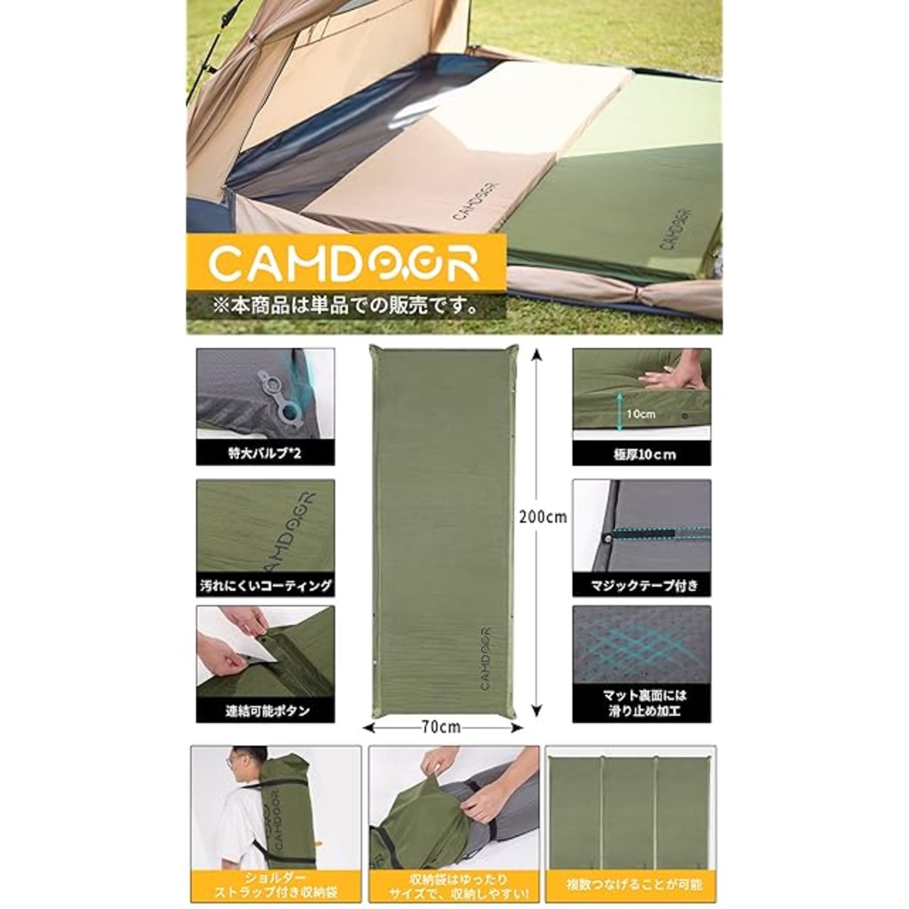 CAMDOOR キャンプ マット エアーマット 厚手 10cm【30秒自動膨張・より広い】R値 6.8 インフレーターマット 車中泊マット コンパクト 自動膨張 キャンパー 無限連結可能 キャンプ用品 寝具エアーベッド 防水防潮 安全無臭 持ち運び便利 簡単収納 収納袋付き 2個セット | emishop315