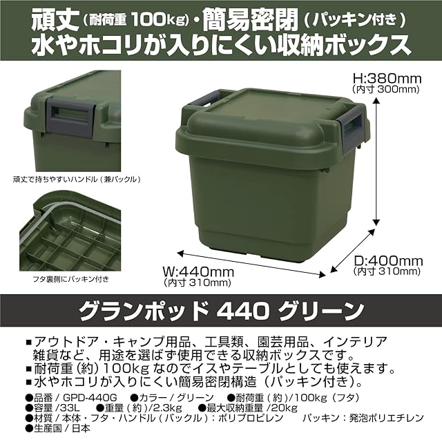 JEJアステージ 収納ボックス 日本製 簡易密閉型 パッキン付き アウトドア キャンプ スツール 耐荷重100kg 積み重ね [グランポット 33L GPD-440G] グリーン 防災 幅44×奥行40×高さ38cm | emishop315