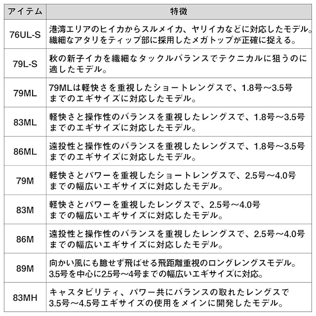 【仕舞(cm)】138 , 【先径/元径(mm)】1.4/10.9 , 【エギサイズ(号)】2.5-4.0