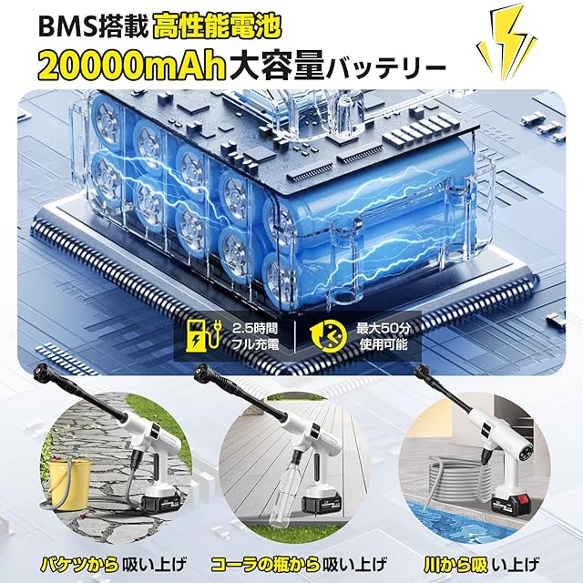 商品名:【2025新登場強化版】高圧洗浄機 コードレス 充電式 バッテリー式 洗車機 20000mAh マキタ互換バッテリー 残量表示 洗車店監修 750W 軽量 小型 自吸式 噴射距離10M 洗車 家庭用 2段階 6in1ノズル 水道接続不要 収納ケー付き 持ち運び便利 庭/屋外/階段/ガラス/ブロック塀/玄関/ベランダ/浴室/年末大掃除/キャンプ 日本語取扱説明書 ホワイト
