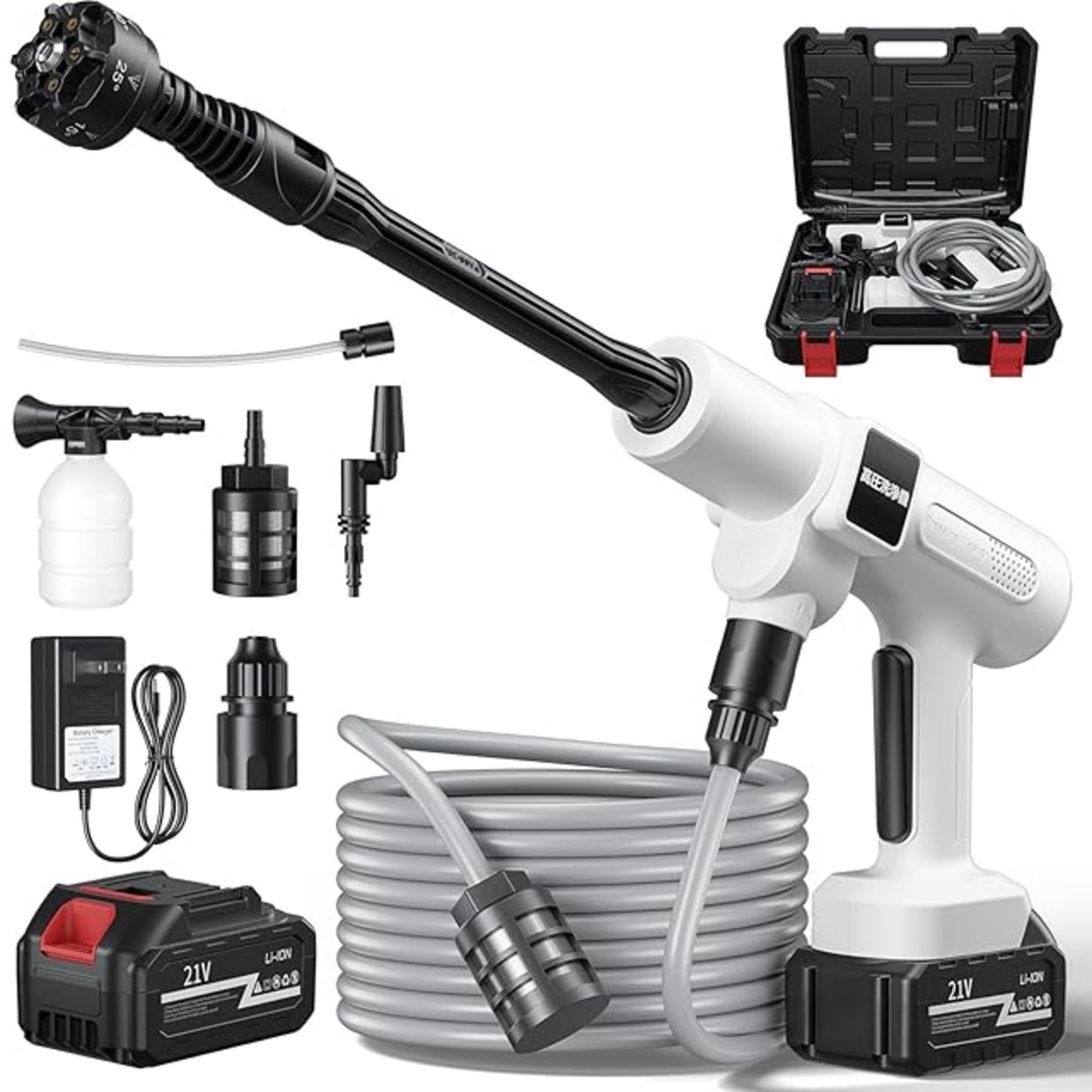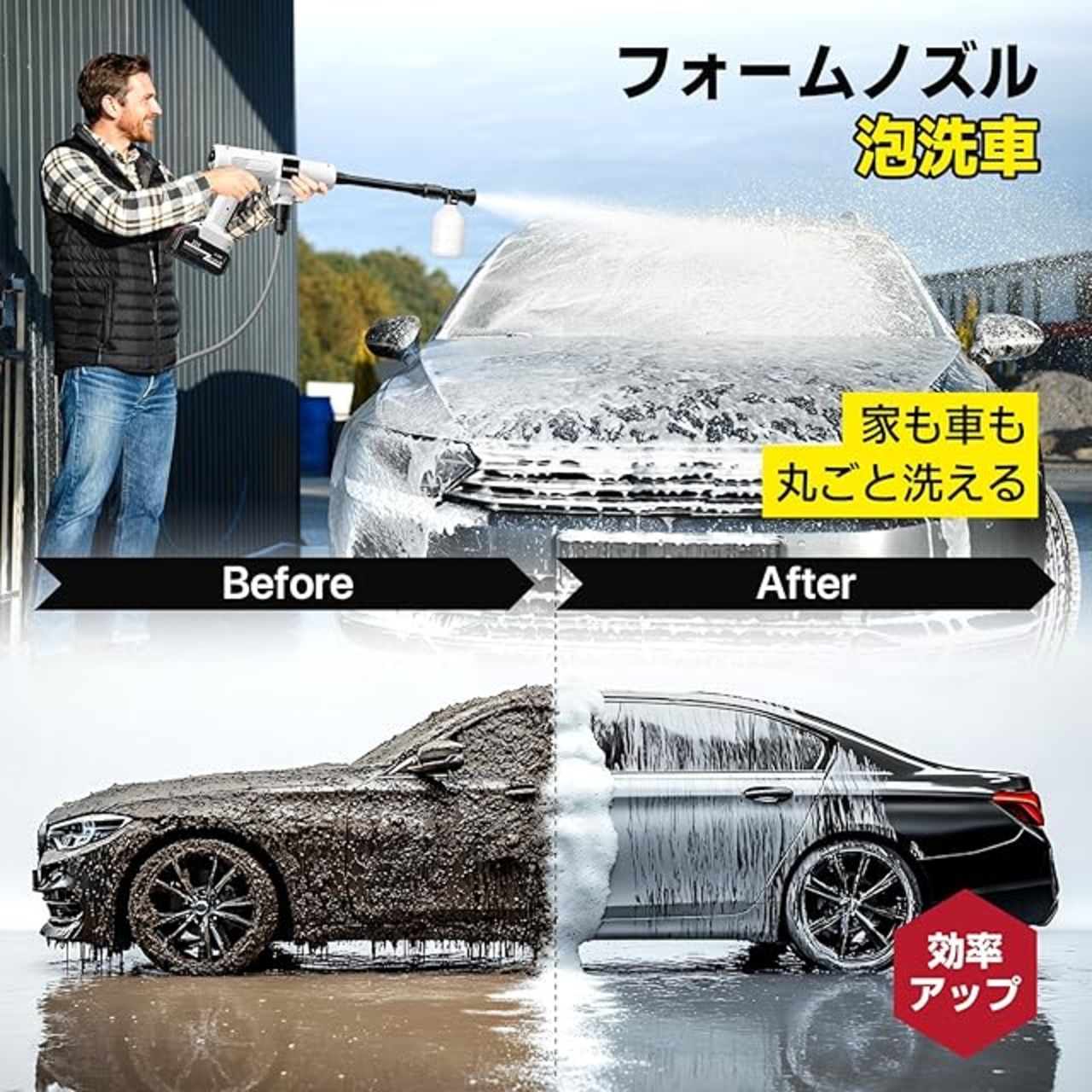 【洗車や大掃除に便利&調節可能】高圧洗浄機は高圧ポンプと高効率の750W純銅ブラシレスモーターを搭載し、水道水の40倍の圧力まで安定した強力な水圧を提供し、高圧噴射による頑固な汚れを簡単に除去します。他社製品に比べ、洗浄機は圧力が20%高いため、洗車時間が10分以上短縮され、効率的な洗浄が可能です。高圧洗浄機は一目でわかるディスプレイ画面搭載、画面の表示により、モード調整や電池残電確認ができます。ハイパワーが実現され、しかも省エネ!低騒音デザインの高圧洗浄機で、水圧を調節できる家庭用モデルなので洗車だけじゃなくさまざまな汚れをラクに掃除!2段階水?モードがあり、射程は最大10メートル、強力な水圧によって、長年蓄積したガンコな汚れを落とすことにもできます。 弾力性があるので洗浄作業中も楽々給水ホースに専用フィルターを利用し、ゴミなど不純物の混入を防ぎます。