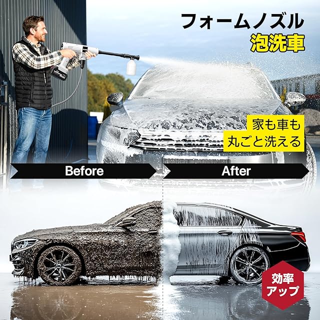 ?【6-in-1多機能ノズル&泡のボトルノズル&左右360°上下180°変換ノズル】高圧洗浄機はオプションパーツは豊富で、6-in-1多機能ノズルは、0°、15°、25°、40°、拡散モード噴射、シャワーモード噴射6つの異なる噴射モードを切り替えることができ、様々な洗浄ニーズに対応します。 泡のボトルノズルの設計により、車内清掃がより効率的になります。付属のボトルに洗剤を入れるだけで、濃厚な泡が立ち、プロ級の清掃が可能です。左右360°上下180°変換ノズルは車の下回り・雨どいなどの手の届きにくい場所の洗浄に適しています。高圧洗浄機は洗車や庭、屋外、階段、網戸・窓ガラス、ブロック塀、外壁、駐車場、玄関まわり、自転車・バイク、ベランダ、高い場所、家まわり、浴室、年末大掃除、キャンプ用品の清掃やBBQの片付けにも大活躍。