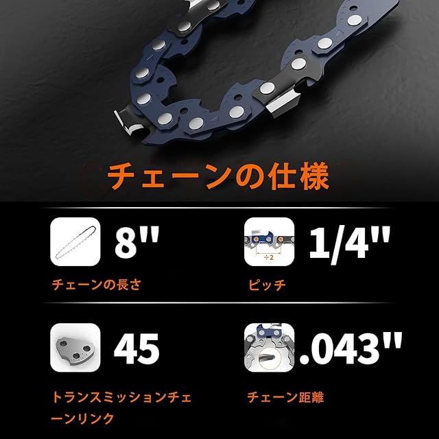 ?【高硬度チェーン】チェーンは高品質の焼入れ素材を採用しており、刃は鋭く、高い硬度と優れた耐摩耗性を備えています。切断効率を向上させ、使用中に切れにくくなっています。