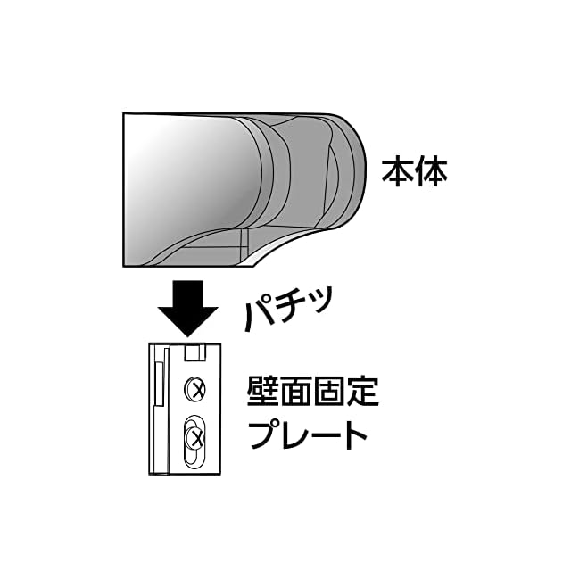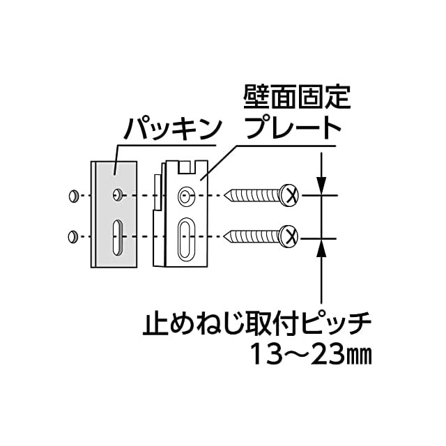 【取付方法】①パッキンを壁面固定プレートの裏側に貼り、止めねじで固定します。止めねじは確実に締め付けてください。締め付けないとガタツキの原因になります。②本体を壁面固定プレートの上からスライドさせ、パチッと音がするまで確実に押し込みます。