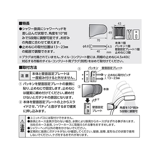 止めねじの取付位置は13〜23mmの範囲で調整できます。※プラグは付属されていません。タイル・コンクリート壁には、同梱の止めねじ4.5X40に対応する市販のタイル・コンクリート用プラグ(別売)をはめて取付けてください。