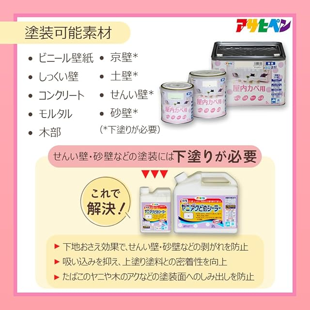 用途:(屋内外区分:屋内用)●リビング、寝室、子供部屋などの室内壁や天井(カベ紙・ビニールカベ紙)。●窓枠などの木部。●和室壁や天井(しっくい壁・京壁・土壁・砂壁・せんい壁・コンクリート・モルタル)。●浴室、キッチン、洗面所、トイレなどの壁や天井。
