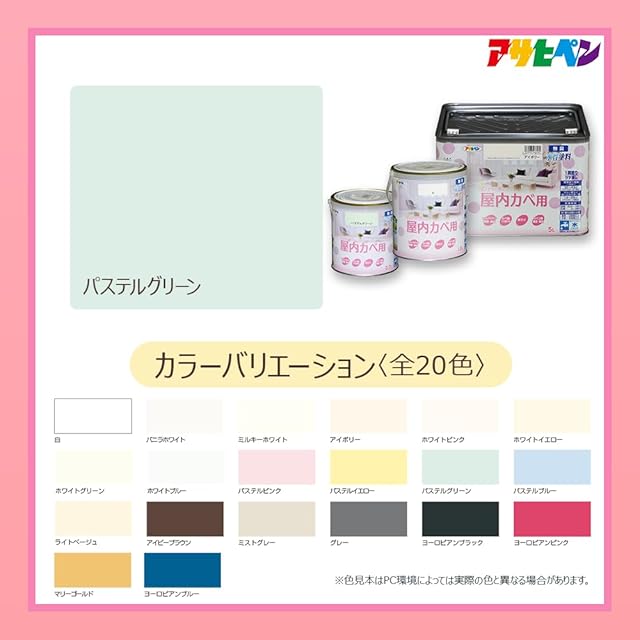 商品名:アサヒペン 塗料 ペンキ NEW水性インテリアカラー屋内カベ 1.6L パステルグリーン 水性 室内 壁用 艶消し 1回塗り 無臭 防カビ 低VOC シックハウス対策品 日本製