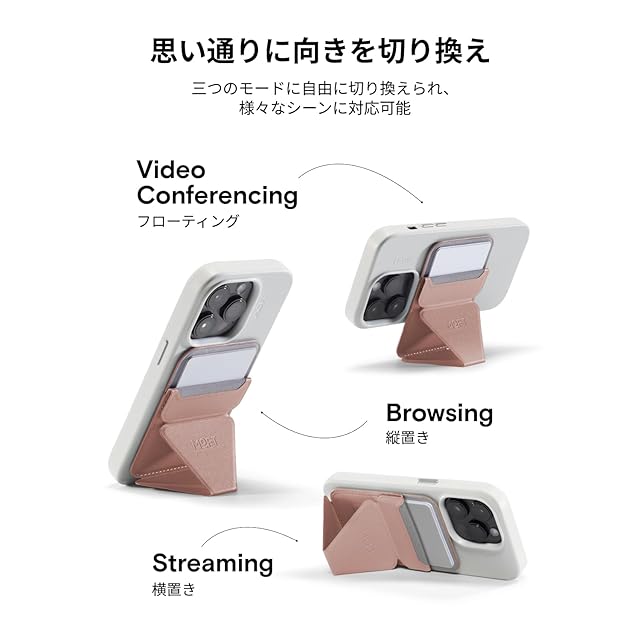 【三つの使用モード・自由に切り換え】マグネット内蔵で、MagSafe対応機種(iPhone17/16/15/14/13/12シリーズ)にお使いいただけます。縦置き、横置き、フローティングモードに自由に切り換えられ、様々なシーンに対応可能です。
