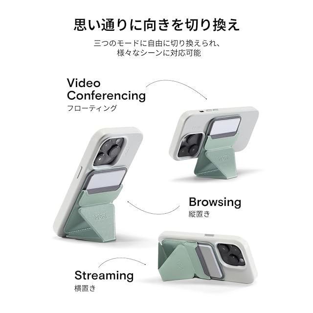 【三つの使用モード・自由に切り換え】マグネット内蔵で、MagSafe対応機種(iPhone17/16/15/14/13/12シリーズ)にお使いいただけます。縦置き、横置き、フローティングモードに自由に切り換えられ、様々なシーンに対応可能です。