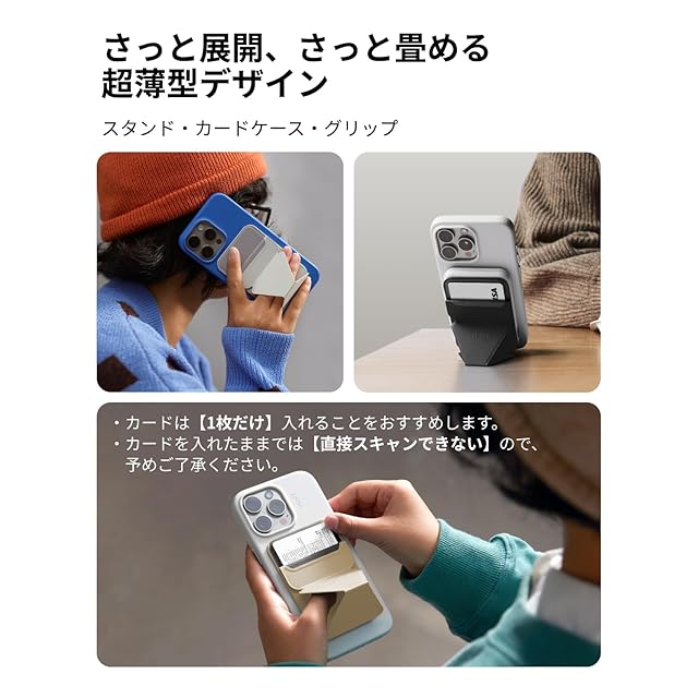 【カード1〜2枚収納・身軽に外出】スリムなデザインでありながら、クレジットカードや運転免許証などをすっきり収納可能です。スタンドを展開してすぐに取り出せ、畳めるとカードのようにスマホに付け、場所をとりません。