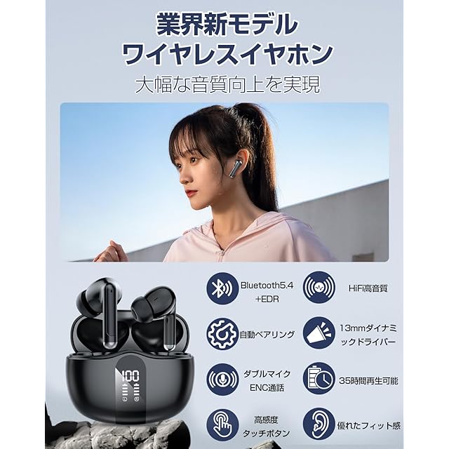 商品名:【2025新開発音質重視モデル ・中高低音バランスが良く】イヤホン bluetooth ワイヤレスイヤホン ブルートゥース イヤフォン Bluetooth5.4 LEDディスプレイ ダブル マイク ENCノイズキャンセリング Hi-Fi音質 ハンズフリー通話 ぶるーとぅーす カルナ型 35時間音楽再生 iPhone/Android 適用 通勤通学/スポーツ/ゲーム (漆黒)