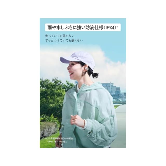 【雨や水しぶきに強い防滴仕様(IPX4)※】 日常生活の中での様々なシーン、天候急変時やエクササイズやジョギング、移動中など、雨や水しぶきが飛んでも使用可能なIPX4相当の防滴仕様を備えています。※JIS 保護等級4 級(IPX4)相当。イヤホン本体のみ対応。
