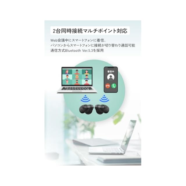 【2台の機器を同時接続できるマルチポイントに対応】 PCとスマートフォンなどの2台の機器に同時接続/待ち受けが可能なマルチポイントに対応。PCによるオンライン会議中にスマートフォンで着信・通話をする、通勤時にスマートフォンで音楽を再生する、出社後にPCでオンライン会議をするといった際、Bluetooth接続の切り替え操作なしで使用できます。