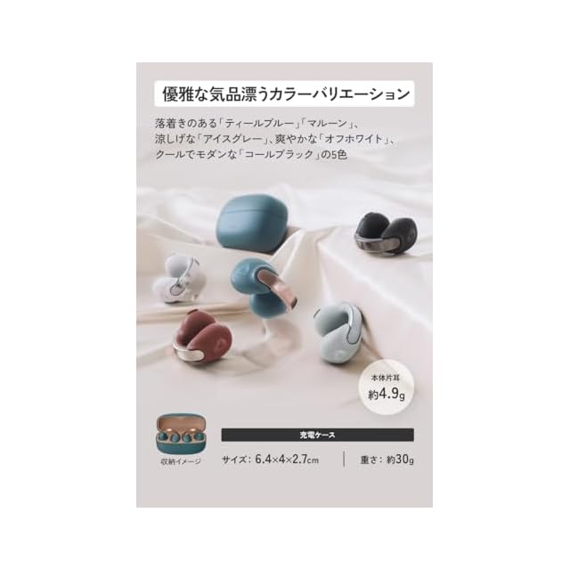 【アクセサリー感覚の軽く快適なつけ心地】 本機は、アクセサリー感覚で身に着けられるイヤーカフ型を採用。イヤホン本体には、当社独自の「フレキシブルアジャスト」機構を搭載し、耳に軽く挟んで装着する際に着脱しやすくするとともに、軽く快適な着け心地も実現。眼鏡やサングラスを着用したままでも使用でき、エクササイズやジョギングなど動きのあるシーンでも、長時間装着する場合でも、快適に使用できます。