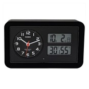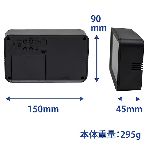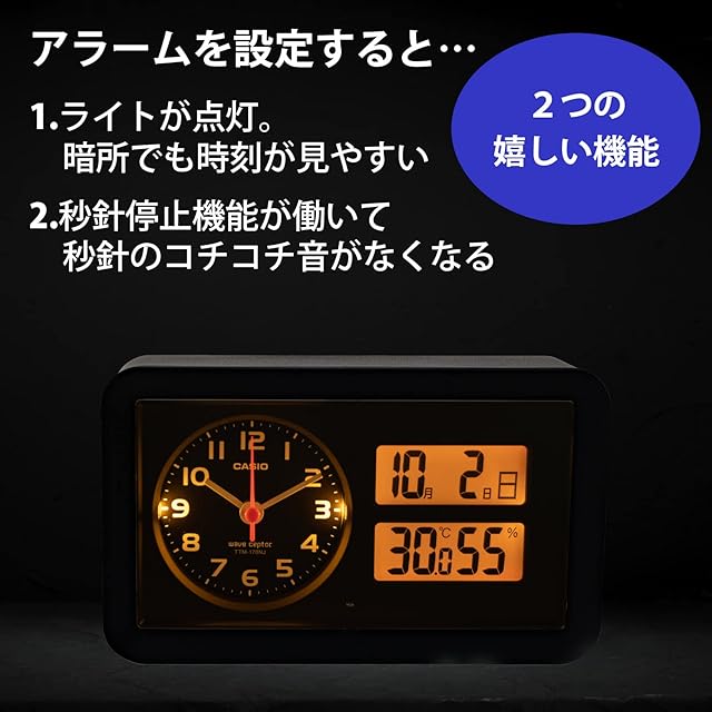 機能・仕様:電波受信機能(自動受信/手動受信切り替え、自動選局機能付き)、電子音アラ-ム(5段階で変化)、止めても止めてもまた鳴るスヌ-ズ機能(約5分おきに7回繰り返す)、LEDライト(残照機能、自動点灯)、秒針停止機能(明暗センサ-により暗くなると秒針が停止)、月・日・曜日表示、フルオ-トカレンダ-、温度表示、湿度表示、電波受信インジケ-タ-、電波受信マ-ク表示、液晶表示コントラスト調整