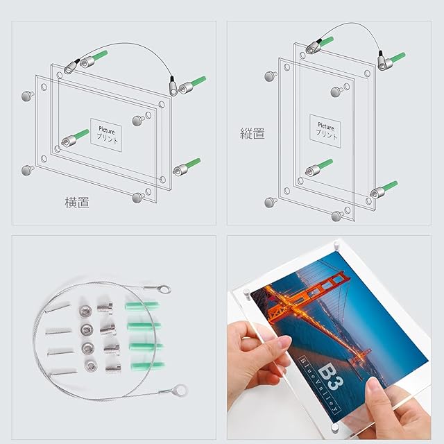 商品名:BlueValley B3 額縁、アクリルスタンド、アクリルフォトフレーム、スタンドタイプ 写真フレーム、両面透明ポスターフレーム、写真立て 壁掛け兼用 、展示ピクチャー・ポスター・絵画・賞状用 横縦置き (収納サイズ: 353x500mm)