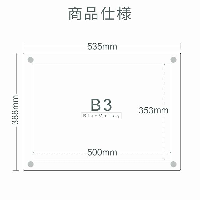 【適用サイズ&特徴】外寸388×535mmのB3対応フレームレスアクリル額縁。B3サイズ(353x500mm)の写真、賞状、証明書、サイン色紙、ポスターに対応。