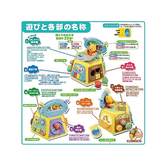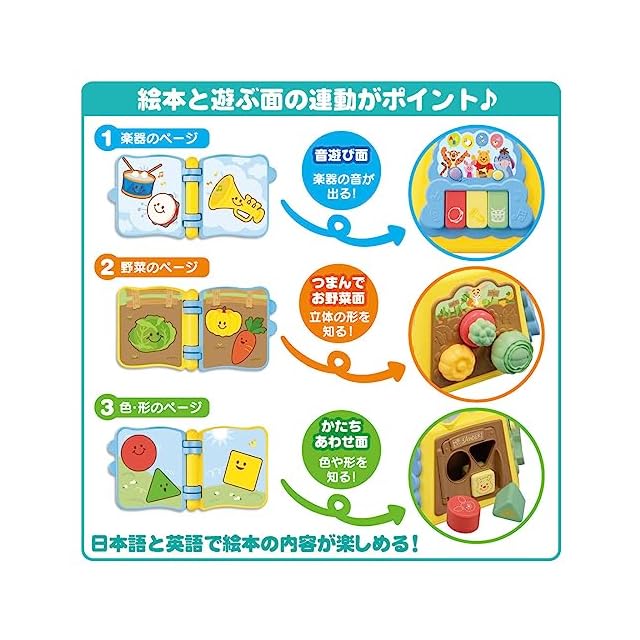 プーさんが絵本の内容をはなして、色・形・音を楽しく覚えられる