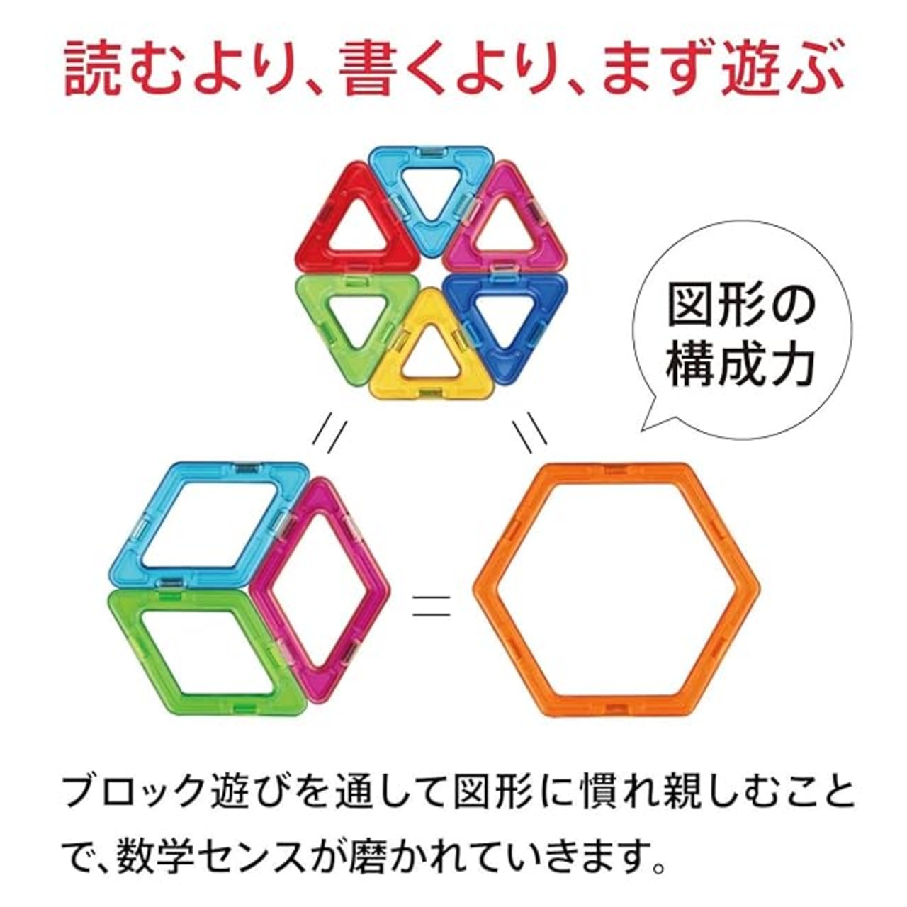 【世界63ヶ国で人気沸騰中! 磁石でつながる数学ブロック】くっつけてはなして、自分のセンスを生かしながら、様々な形や世界観をつくれる磁石内蔵のマグネットブロック! 様々な形を組み合わせて、オリジナル作品も作れるおもちゃです。