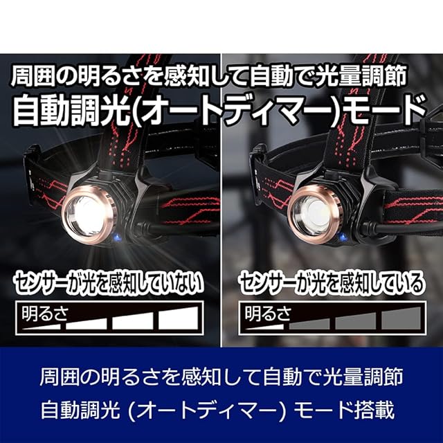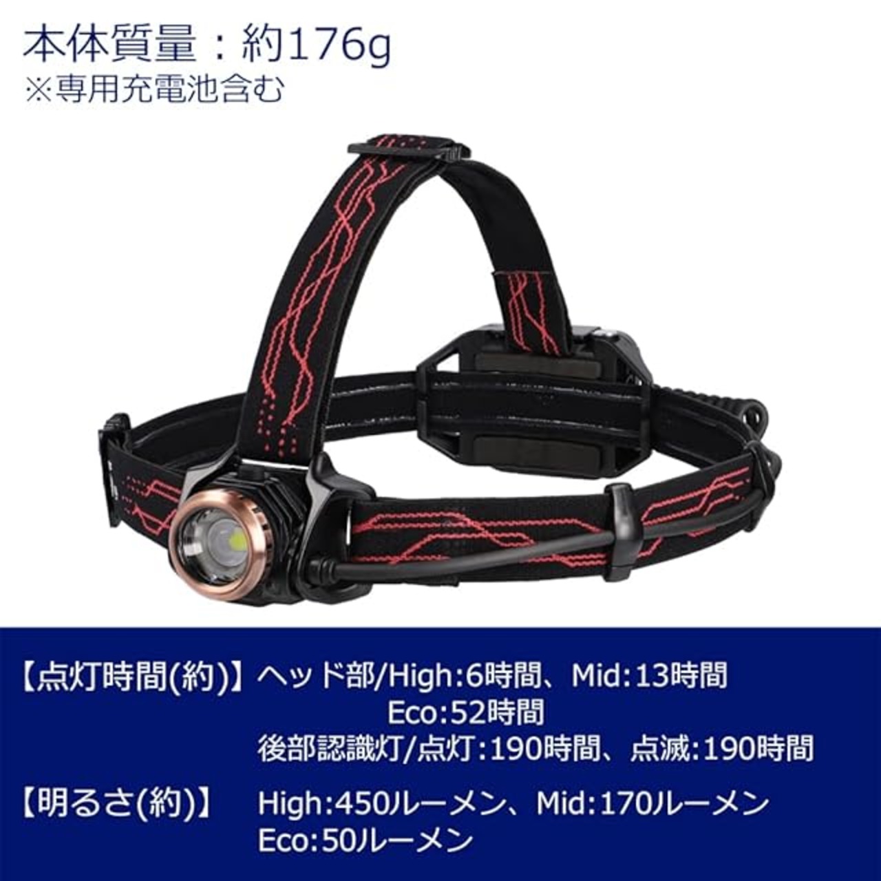 明るさ:High/450ルーメン、Mid/170ルーメン、Eco/50ルーメン、使用電池:専用充電池または単4形アルカリ電池×4本(別売り)