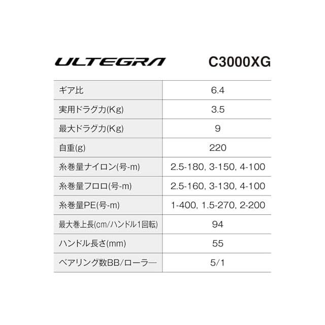 糸巻量:ナイロン(号-m) 2.5-180、3-150、4-100 / フロロ(号-m) 2.5-160、3-130、4-100 / PE(号-m) 1-400、1.5-270、2-200