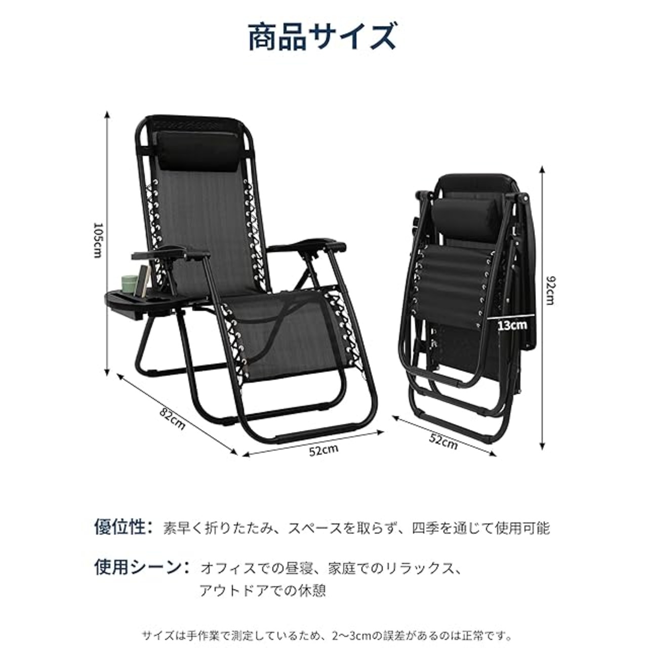 超耐荷材質:高品質の炭素鋼材質、強度が十分です。耐荷重(静止荷重)は余裕の約120kgです。ゼログラビティーアウトドアチェアはストレスフリーの無重量感覚で最大限のリラクゼーションを実現します。