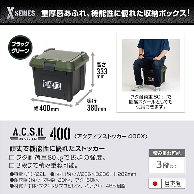 JEJアステージ(JEJ Astage) 収納ボックス Xシリーズ アクティブストッカー 400X ブラックグリーン 日本製 コンテナ 防災 [幅40×奥行38×高さ33.3cm] | emishop315