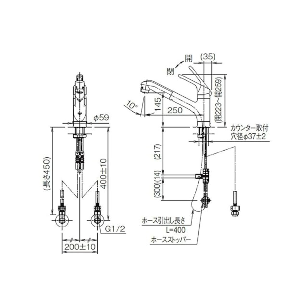 【本体仕様】取付カウンター厚み:許容範囲6~30mm/ホース引出長さ:約40cm/水栓取付穴:φ37±2mm/吐水パイプ長さ:250mm